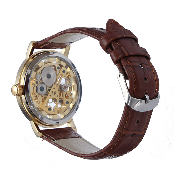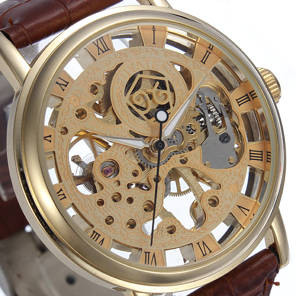 Gold Tone Skeleton Leather Mechanical Hand Wind Wrist Watch